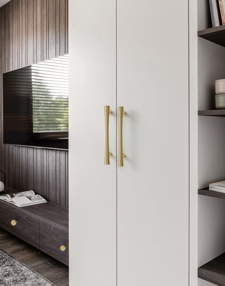 Enhance your home's aesthetic with the Brio Solid Brass Collection. Crafted from premium solid brushed brass, these handles feature a sleek tapered design that seamlessly blends modern style with traditional charm. Elevate the elegance of your cabinets or drawers with lasting strength and opulent feel. Ideal for adding sophistication to any living space, these handles are perfect for door knobs, drawer knobs, cabinet knobs, and more.