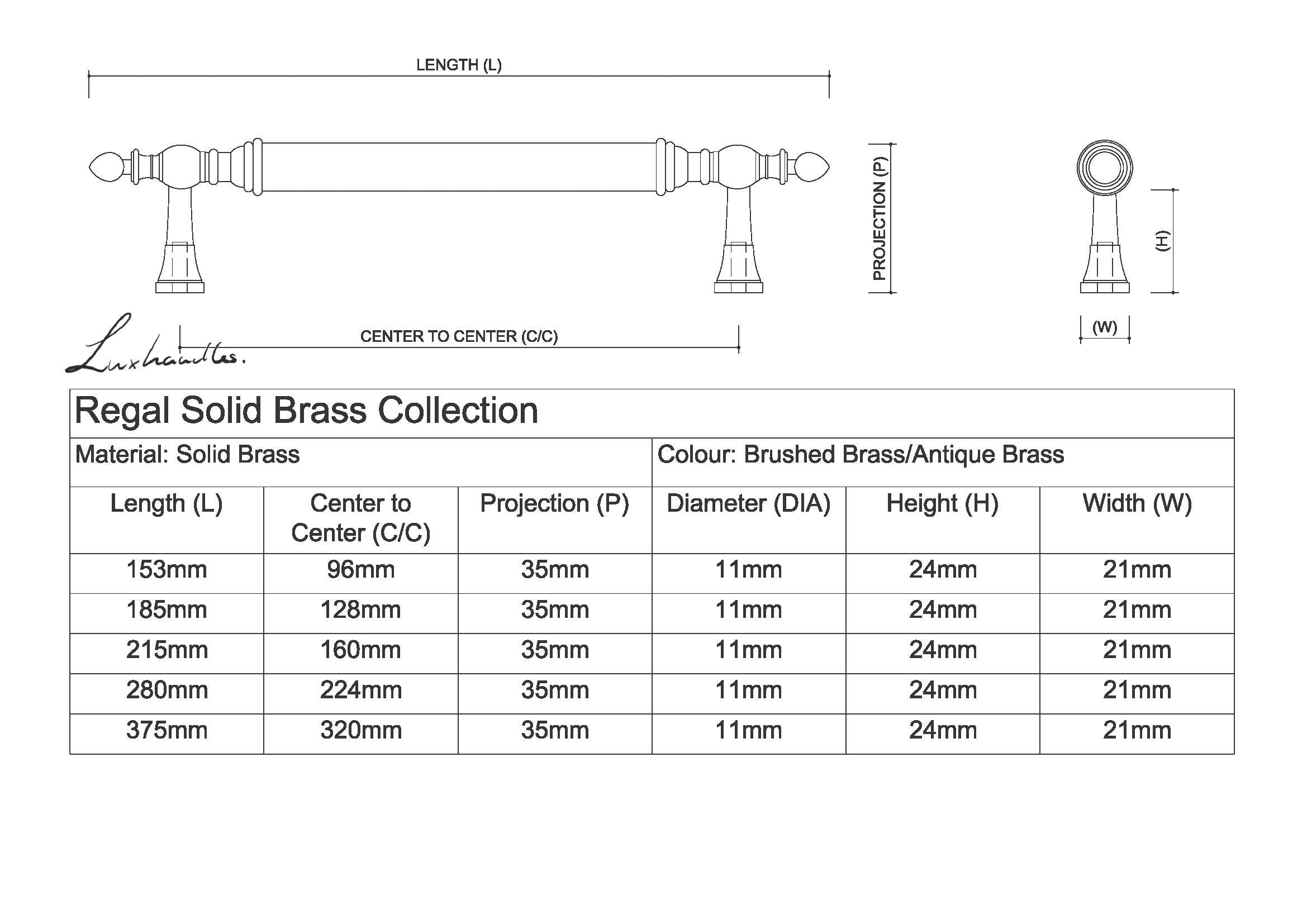 Elevate your home with the Regal Brass Handles, a true expression of timeless elegance and premium design. Each handle is carefully crafted from high-quality brass, giving it a rich, luxurious weight and a brilliant polished finish that speaks of quiet sophistication. Designed with a classic silhouette and subtle detailing, the Regal handle bridges the gap between traditional beauty and modern craftsmanship — the kind of hardware that never goes out of style.