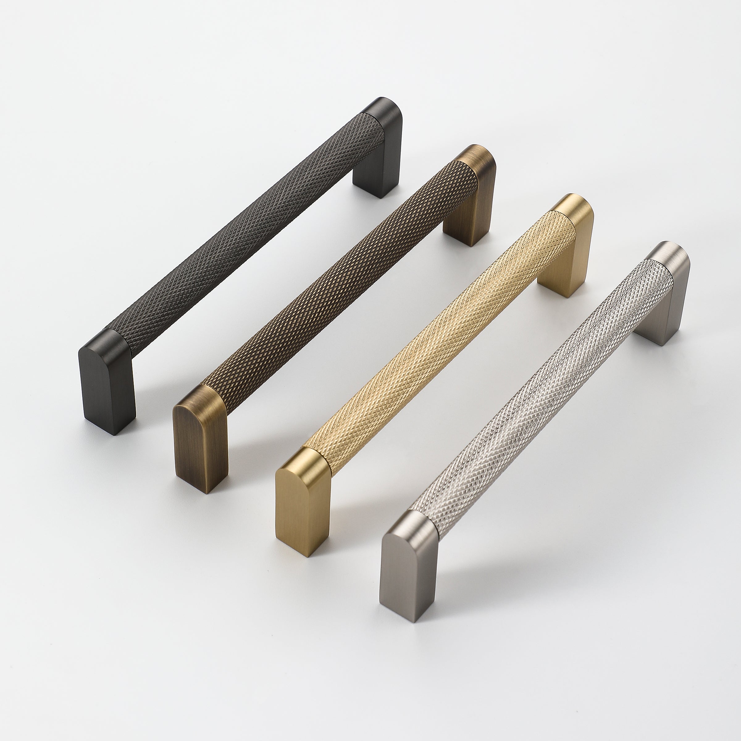 Its finely knurled cylindrical bar features a diamond pattern texture that adds subtle visual detail while providing a comfortable, secure grip. Paired with clean geometric end posts, the design creates a sleek architectural profile that works beautifully in both modern and transitional spaces. The result is a handle that feels refined, balanced, and perfectly suited for premium kitchens, wardrobes, and custom cabinetry.